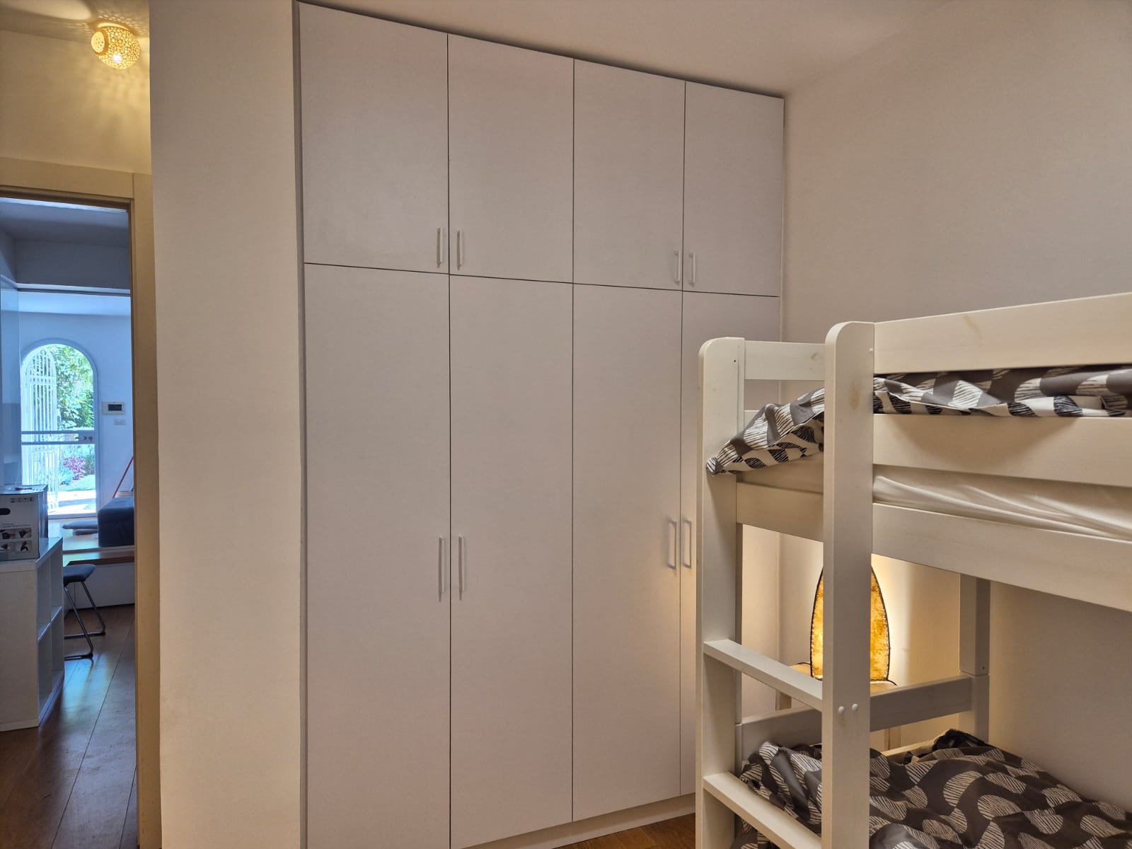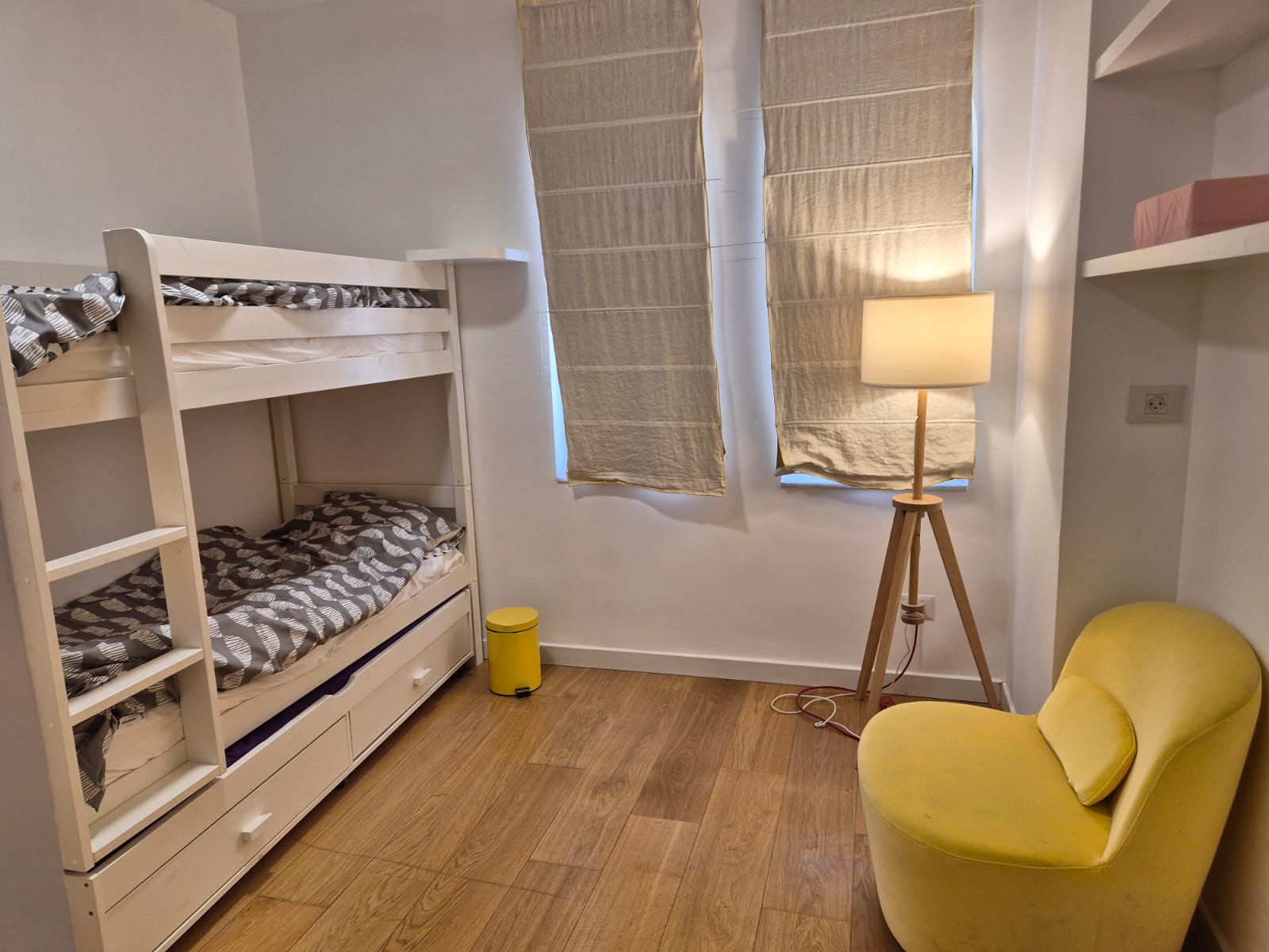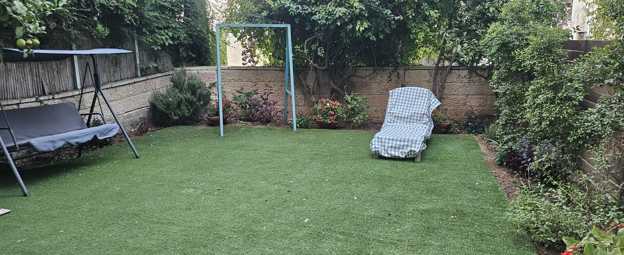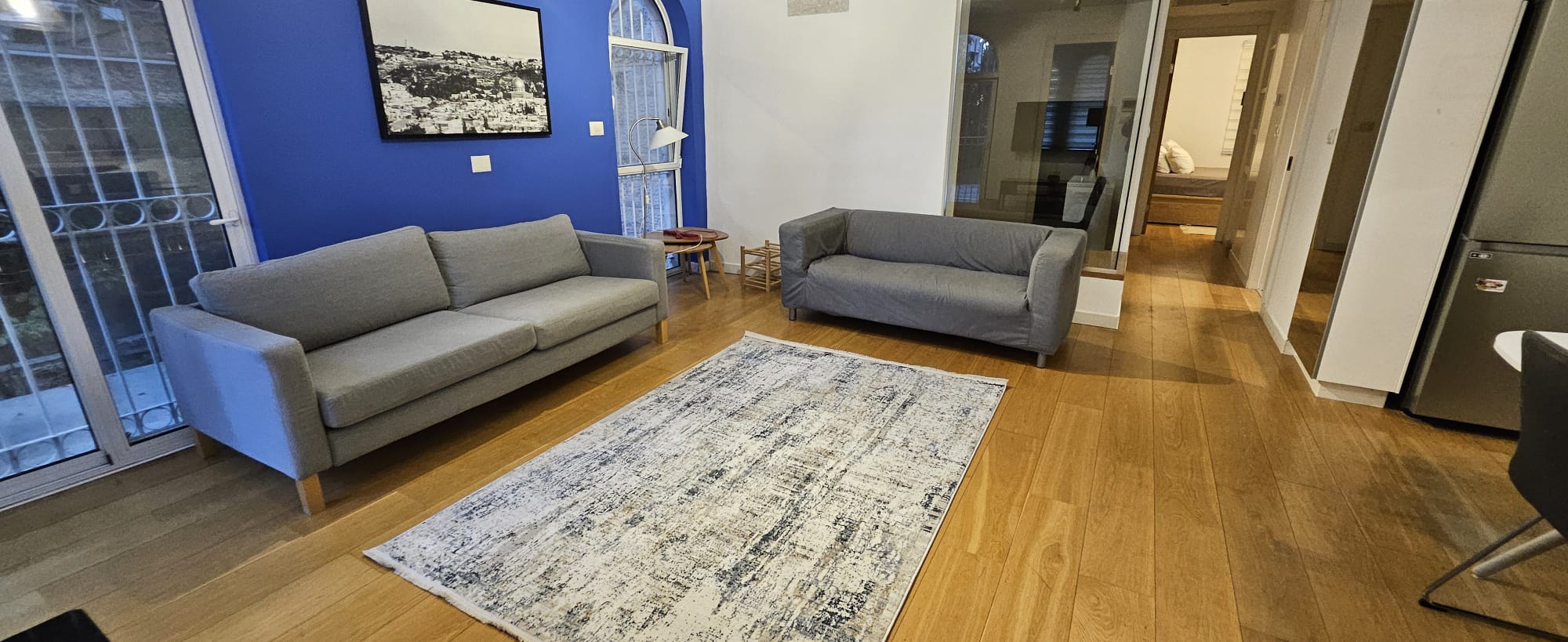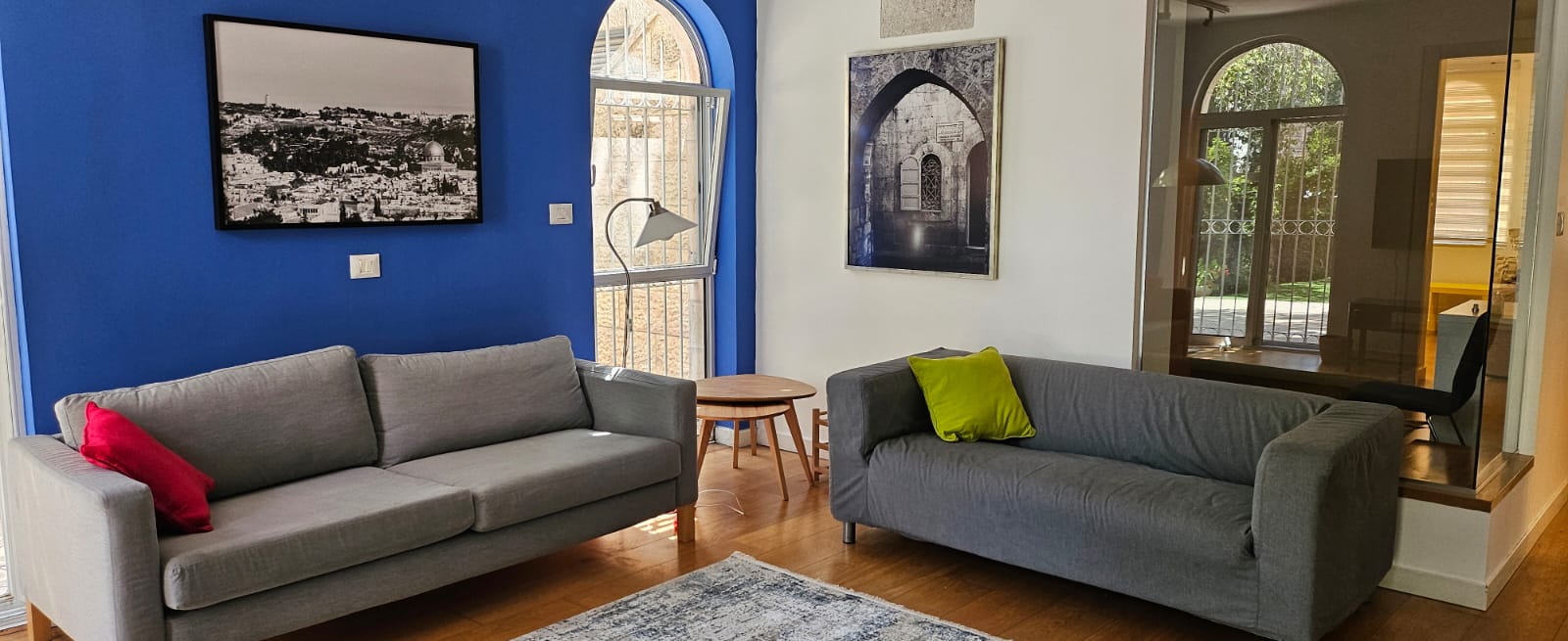 High ceilinged, 3-bedroom, 2 bathroom garden apt. on the exclusive Caspi Street in North Talpiot. Private garden; open-plan, light-filled, equipped kitchen, dining/living room area. 3 bedrooms (including Mamad/safe room) + central den/office space. En suite bathroom (with step-free shower) from the main bedroom, 2nd full bathroom with shower in the bath. Sleeps 7 comfortably.